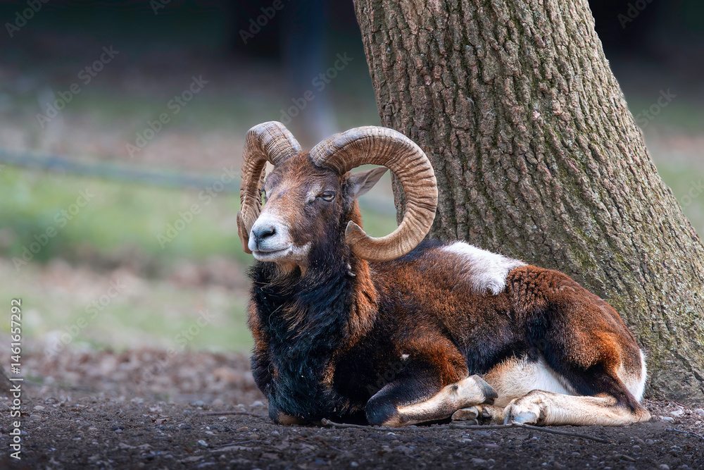 large mouflon ram resting on the ground