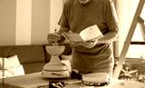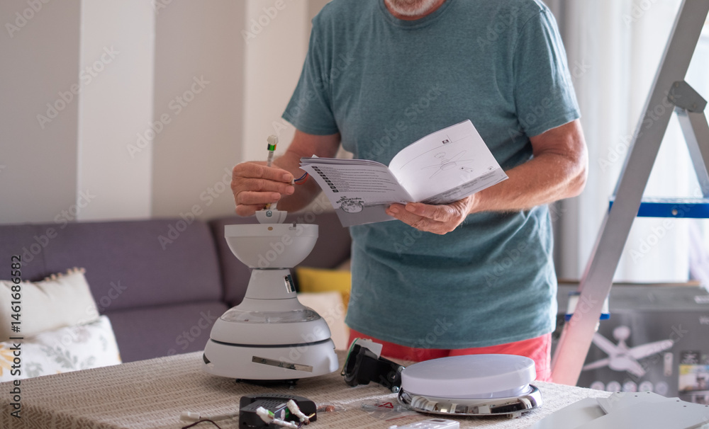 Senior man works installing a paddle fan on the ceiling at home, home improvement and DIY concept