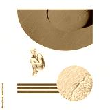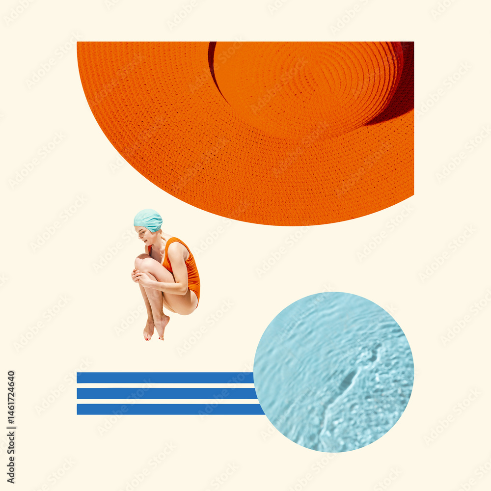Poster. Conceptual collage. Woman in swimsuit and swim cap curling into diving pose near oversized orange hat and pool circle on beige background. Concept of summer, mood, relaxation, vacation, fun.