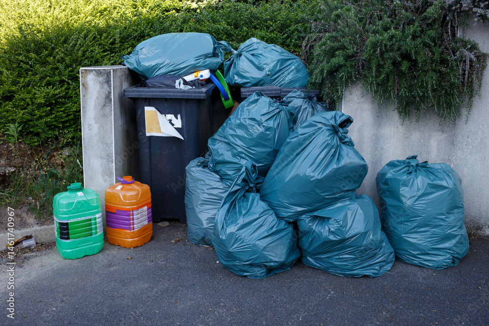 Overflowing outdoor garbage bin with large pile of green trash bags and plastic canisters near concrete wall and greenery. Urban waste management and recycling concept. Street photography