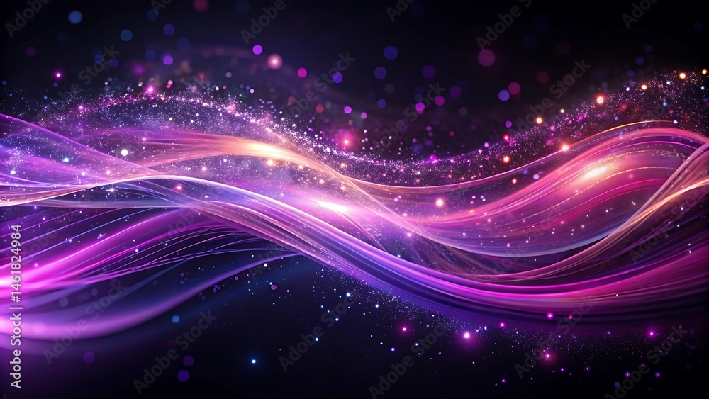 Abstract flowing lines in shades of purple and pink with shimmering particles on dark background