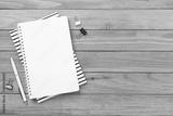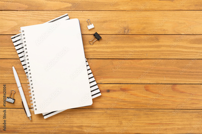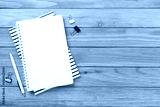 Notebook with stationary on wooden background, top view