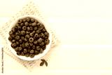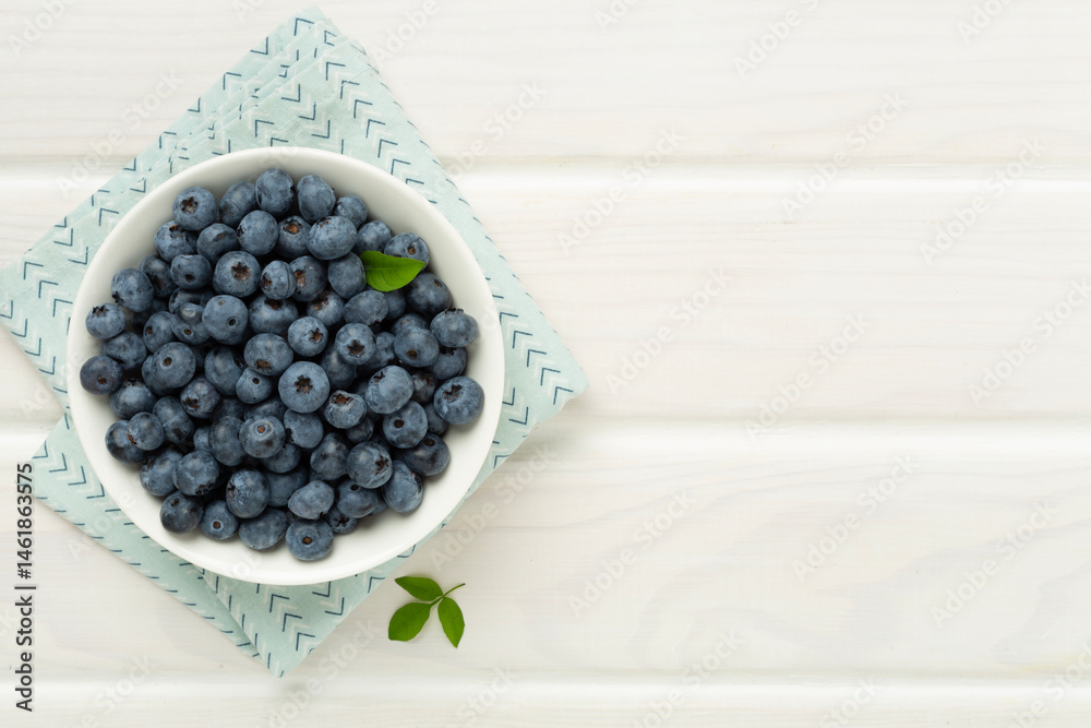 Bowl with fresh bright blueberries on wooden background,top view