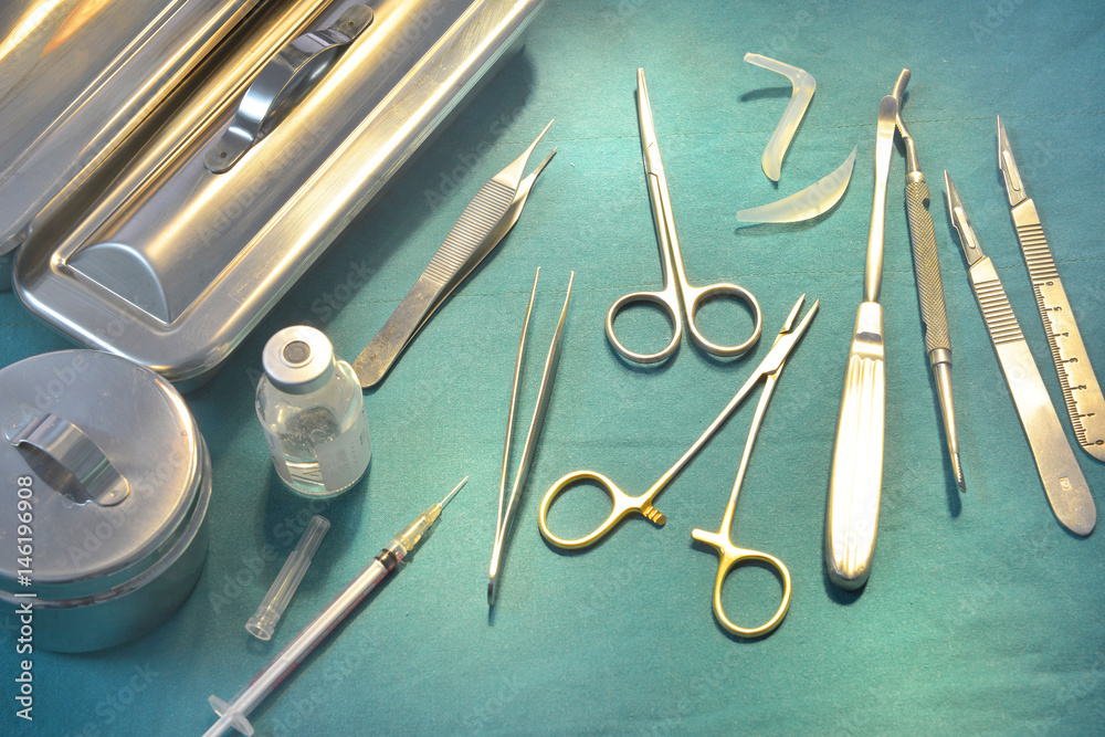 Surgical instruments, silicone nasal implant and silicone chin implants in operating room.