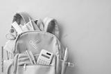 A neat arrangement of stationery including pencils, rulers, and scissors emerging from a backpack