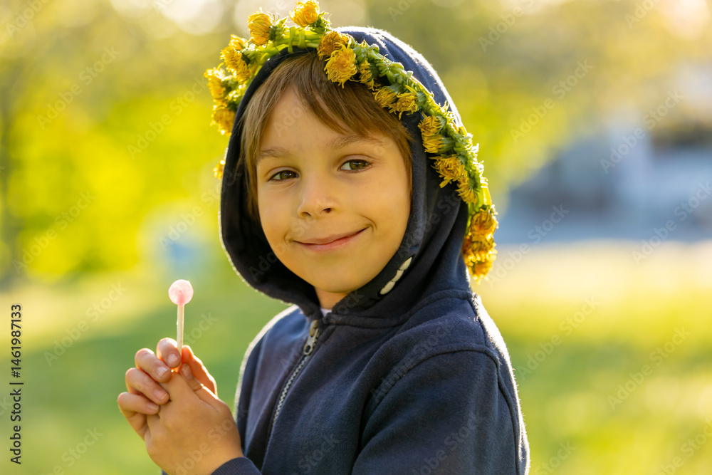 Portrait of cute stylish smiling toddler boy sitting in the grass in park