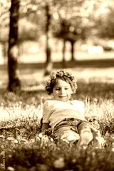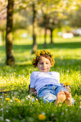 Portrait of cute stylish smiling toddler boy sitting in the grass in park