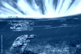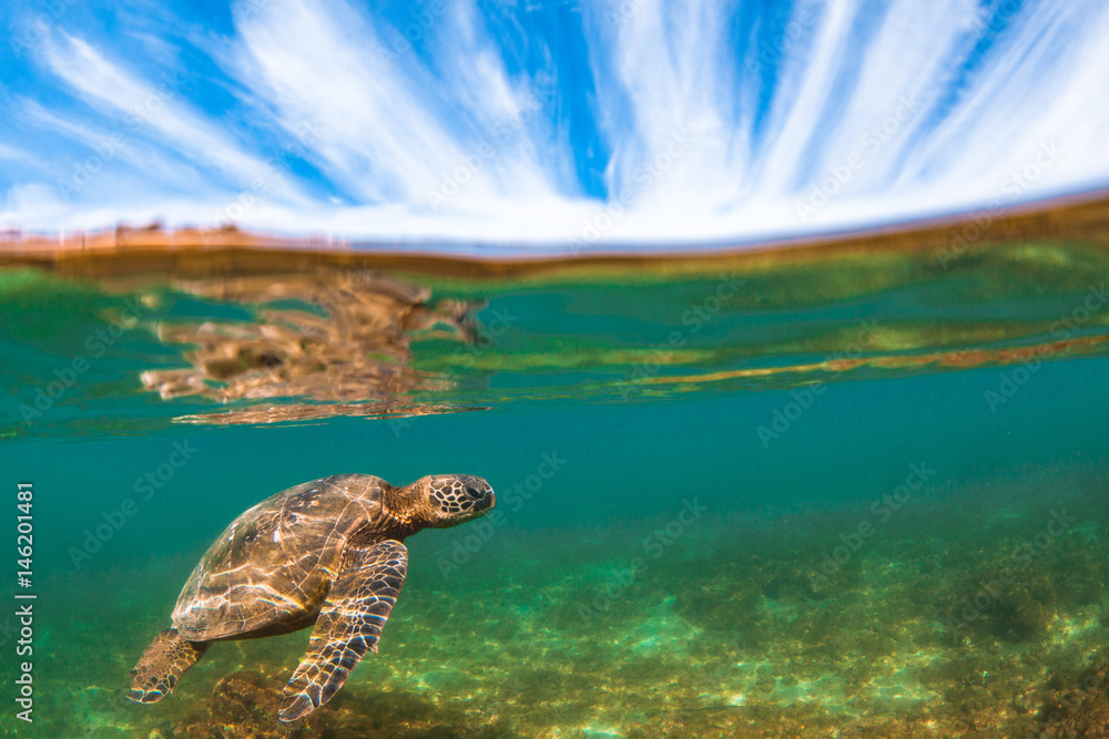 Endangered Hawaiian Green Sea Turtle cruising in the warm waters of the Pacific Ocean in Hawaii