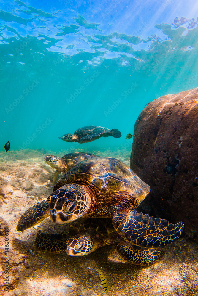 Endangered Hawaiian Green Sea Turtle cruising in the warm waters of the Pacific Ocean in Hawaii