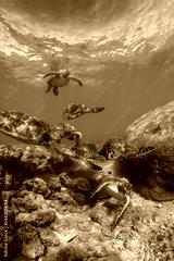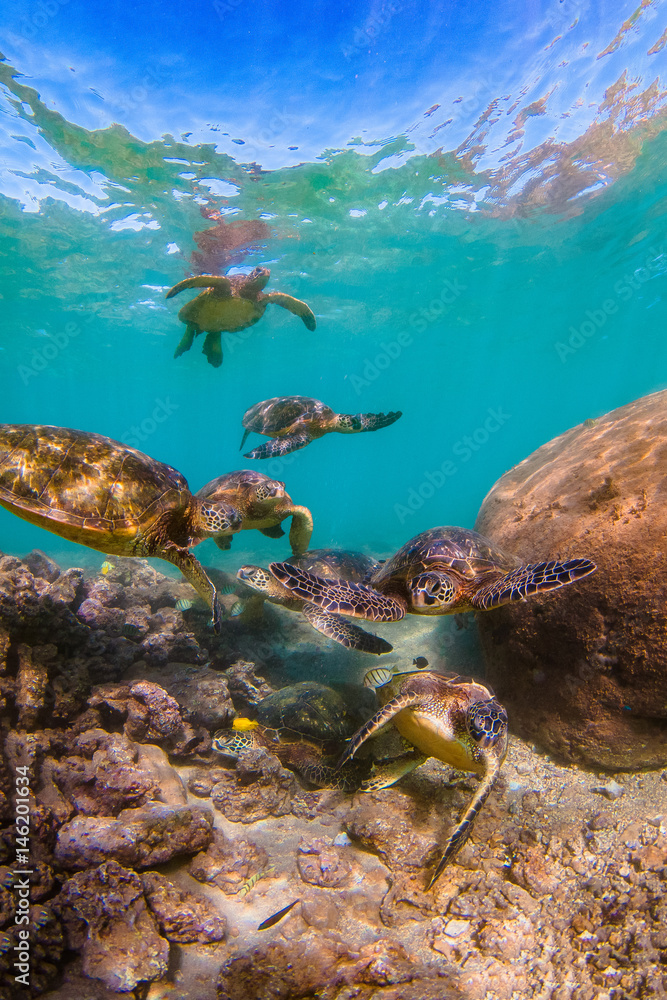 Endangered Hawaiian Green Sea Turtle cruising in the warm waters of the Pacific Ocean in Hawaii