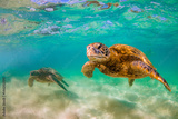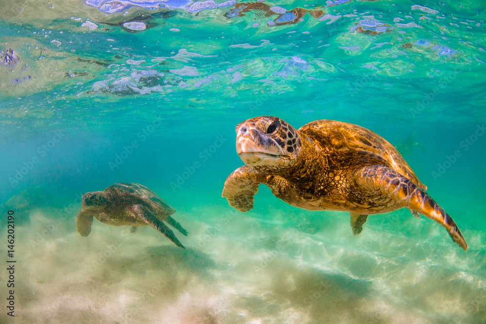 Endangered Hawaiian Green Sea Turtle cruising in the warm waters of the Pacific Ocean in Hawaii
