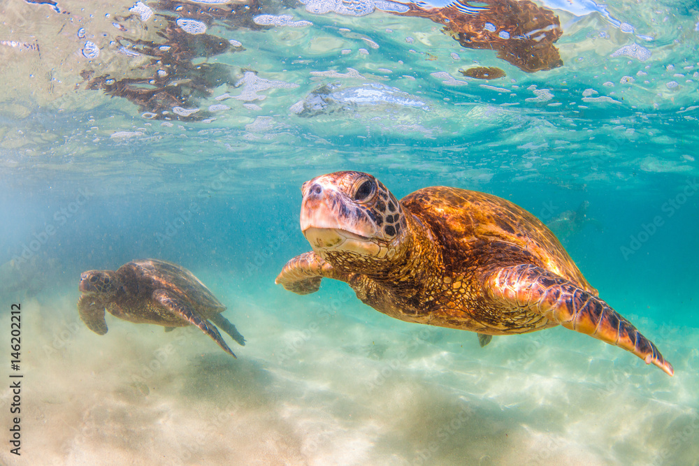 Endangered Hawaiian Green Sea Turtle cruising in the warm waters of the Pacific Ocean in Hawaii