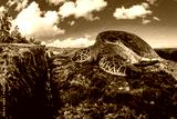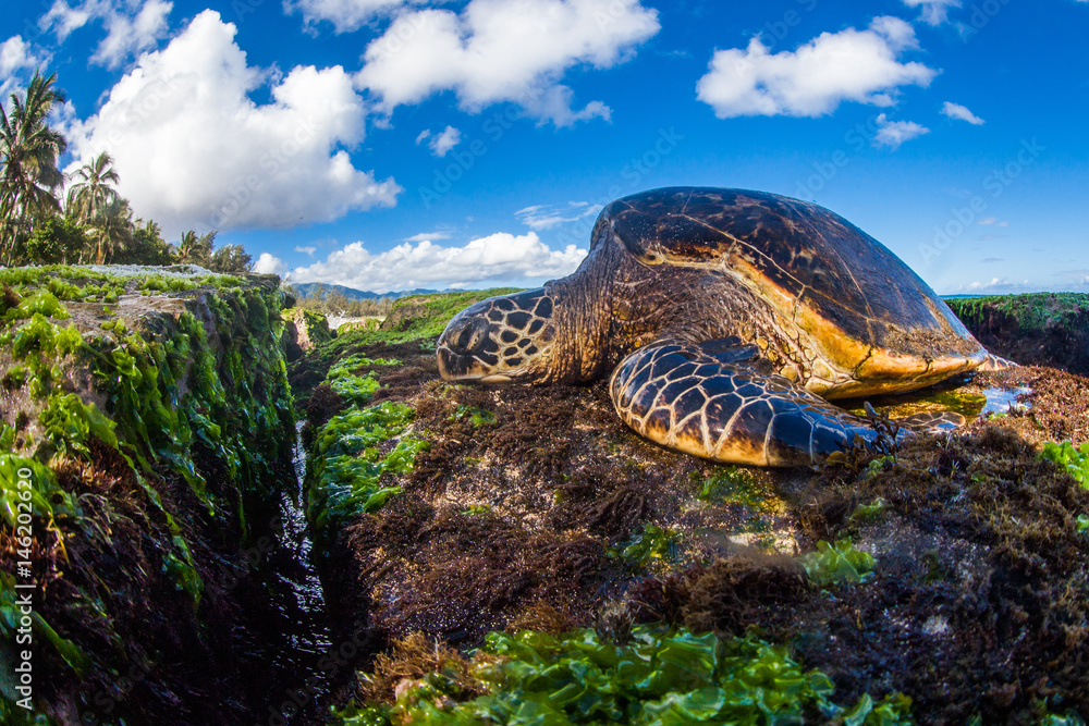 A Hawaiian Green Sea Turtle lounges on the shores of the Pacific Ocean in Hawaii
