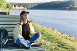 Woman meditating in sunny nature, relaxing, sitting barefoot on bench by river in butter yellow clothing. Peaceful outdoor mindfulness, tech-free slow living, wellness, aging well, young graying hair