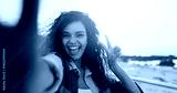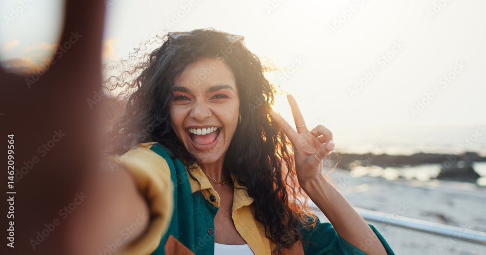 Beach, selfie and woman with peace sign, vacation and travel with profile picture, social media and ocean. Portrait, person and seaside with live streaming, tropical island or influencer with holiday