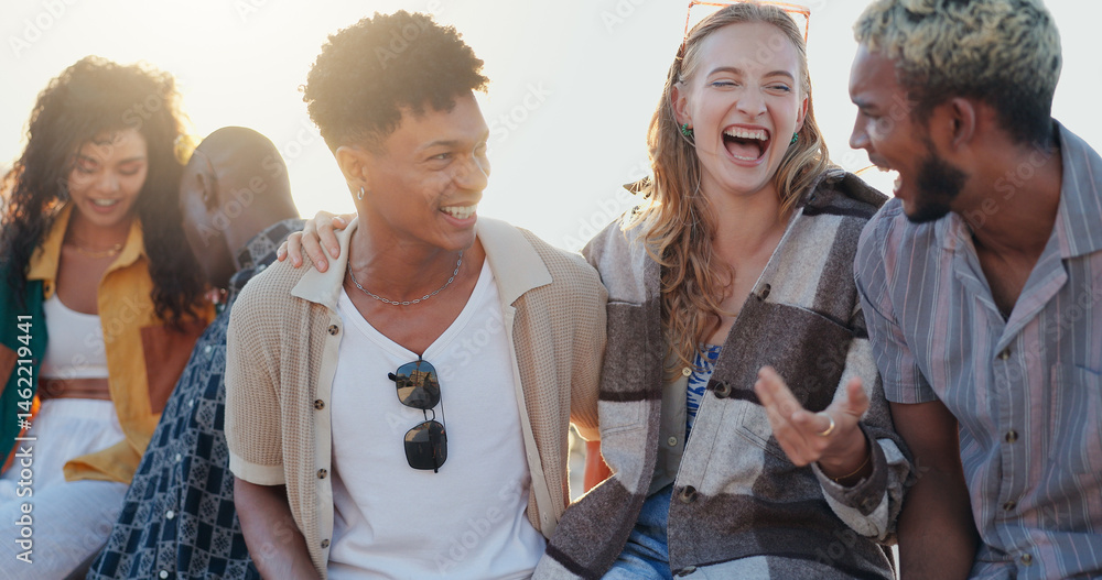 Couple of friends, travel and laugh outdoor on holiday, vacation and relax with gen z students on gap year. People, happy group and conversation for tourism, talking and share funny story with joke