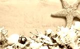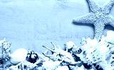 Summer concept. Sea shells and starfish on a blue background.