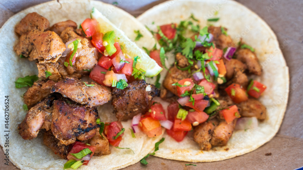 2 taco of chicken and beef. Taco is favourite food in the US. The corn shell is lightly grilled to create crunchy feeling while the topping is meaty. Goes with to cubes, cilantro and lime juice