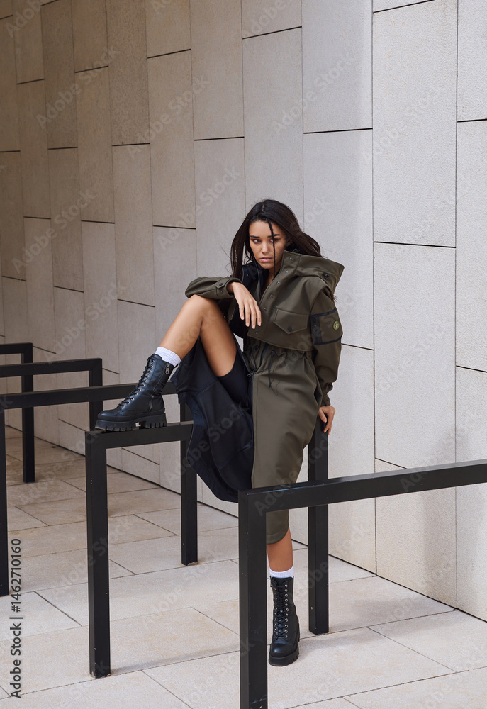 Portrait of a girl model in stylish clothes, shooting in an urban environment.