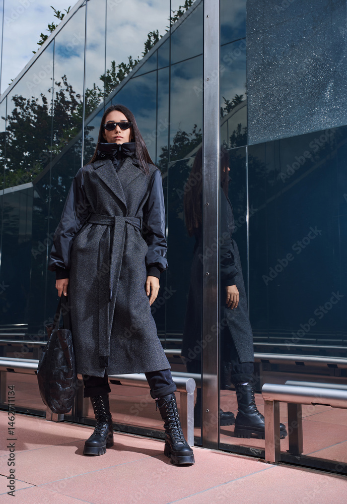 Portrait of a girl model in stylish clothes, shooting in an urban environment.