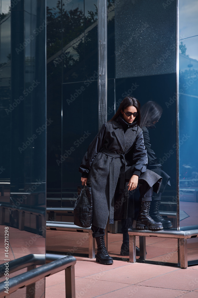 Portrait of a girl model in stylish clothes, shooting in an urban environment.