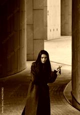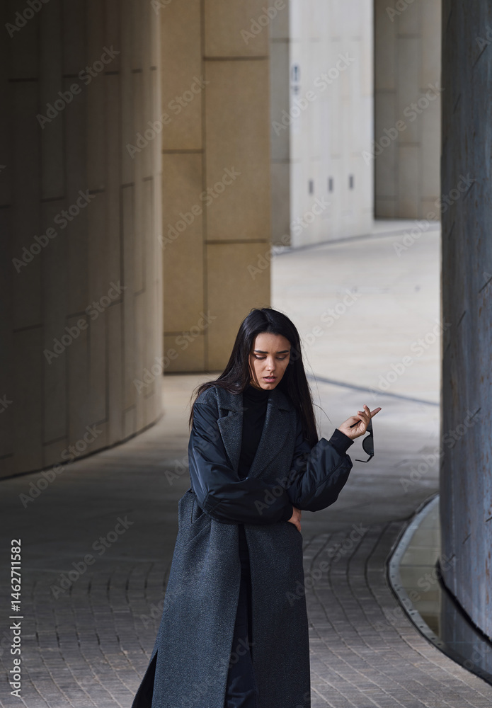 Portrait of a girl model in stylish clothes, shooting in an urban environment.