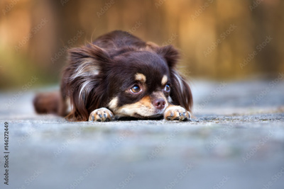 brown chihuahua dog lying down outdoors