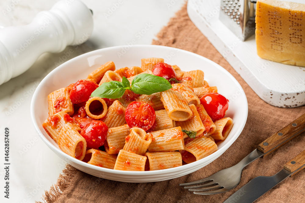 White plate with Pasta rigatoni integrale ot whole wheat pasta with tomato and basil sauce. Hard cheese on background. Healthy meal, higher in fiber and other nutrients.