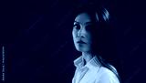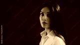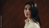 Studio portrait of a young Asian woman with long black hair wearing a white shirt, looking intensely over her shoulder against a dark red background