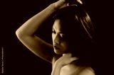 Asian model touching her long brown hair with hand on red background in studio, copyspace available