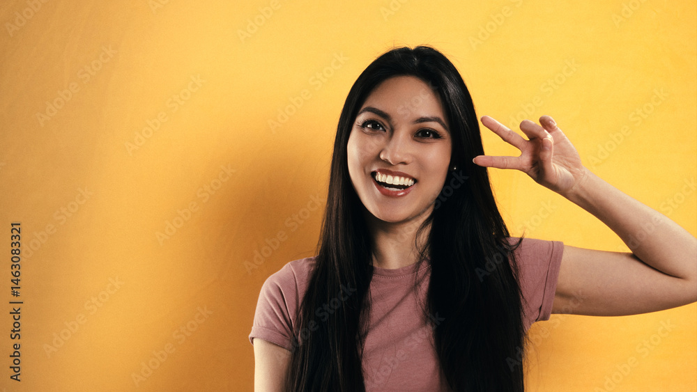 Smiling young Asian woman gesturing the number three with her fingers on a vibrant yellow background, offering copy space