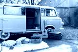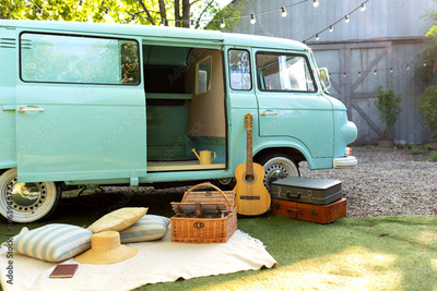 A place for relax nature with a picnic basket, plaid, guitar. Old vintage bus in garden. Blue classic Transporter retro vehicle with suitcases. Wedding auto decoration. Mint mini-bus in camping.