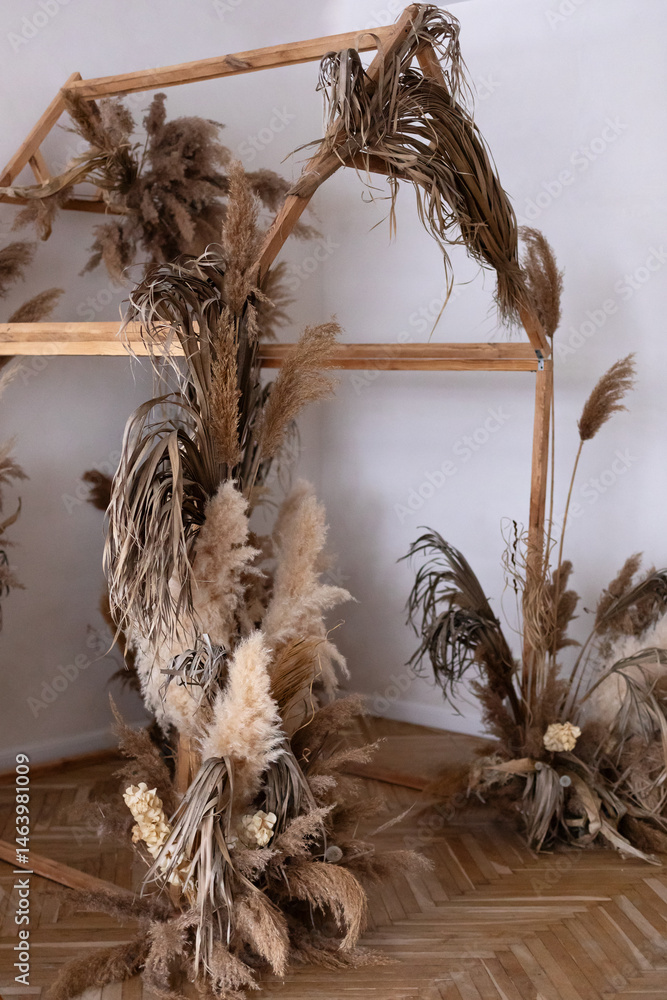 Interior Wooden arch in the form of a house covered dried plants and flowers. Archway decorated plants, pampas grass. Rectangular arch in brown tones made and flowers for wedding decoration.