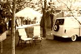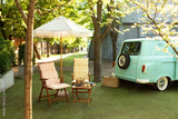 Cozy interior courtyard with table with old radio and sun loungers with umbrella in backyard. Garden furniture for leisure time in nature. Wooden outdoor furniture set for Picnic for campsite.