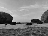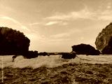 The coast of Chrissy island on a sunny summer day with turquoise sea water, a rocky bottom, black stones in the foreground and a blue cloudy sky with haze.