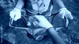 Close-up of gloved hands placing trash into a reusable cloth bag during a forest hike and cleanup, eco-friendly, zero waste lifestyle, sustainable trekking, and environmental responsibility.