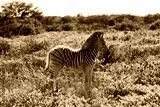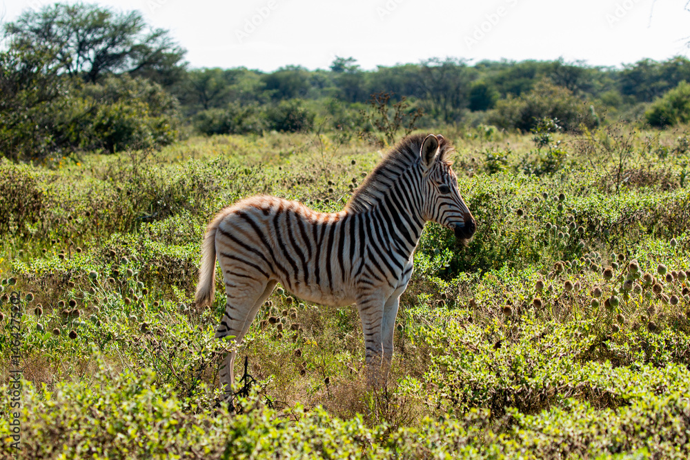 baby zebra standing alone in grass savannah at khama rhino sanctuary