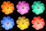 Pack of colored Primula flowers macro isolated on black
