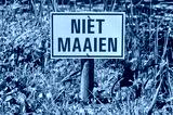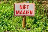 Little sign with, in Dutch, "no mowing", (niet maaien) at a water edge with weeds that indeed haven't been mowed
