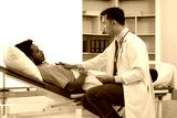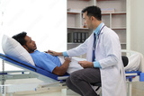Doctor attending patient lying in hospital bed. Doctor visits patient in hospital room.