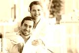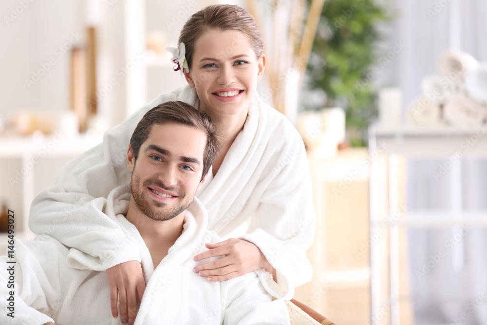 Young happy couple relaxing in spa salon
