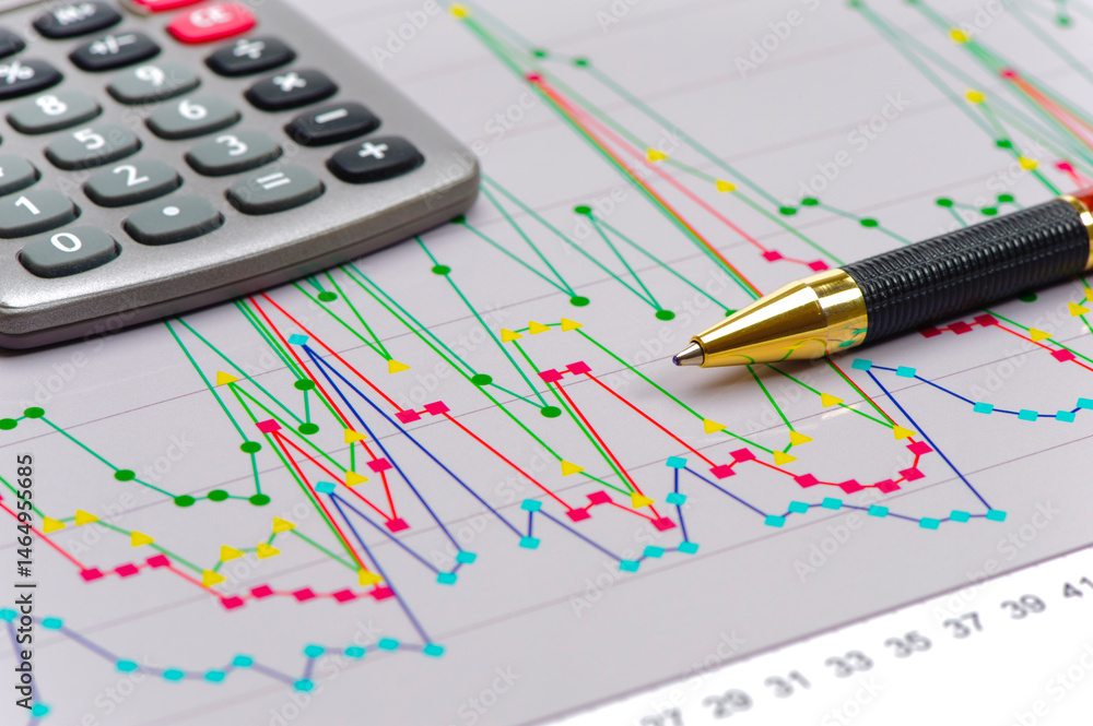 Ein Stift und ein Taschenrechner liegen auf einem Chart mit Kursen und Daten