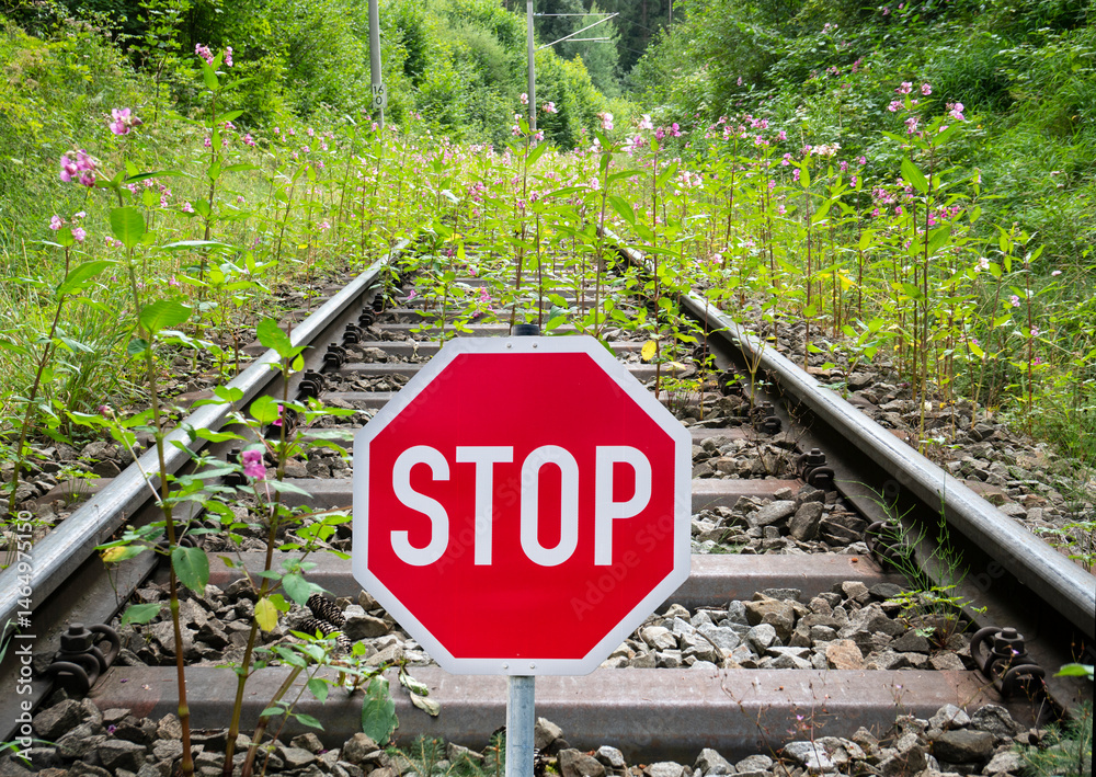 Ein Stopschild steht in deen Gleisen der Bahn vom Unkraut überwuchert - FOTOMONTAGE