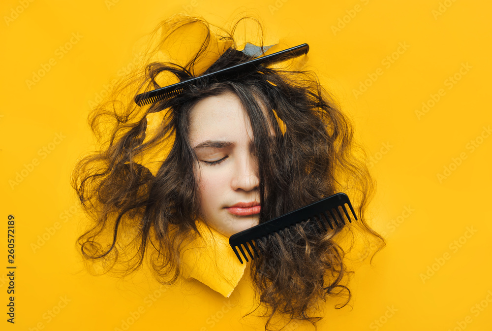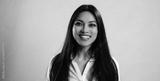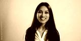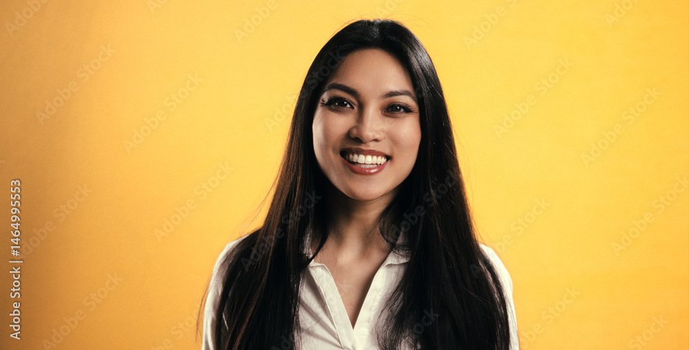 Studio portrait of a cheerful young Asian woman with long black hair, wearing a white shirt, against a vibrant yellow backdrop, with ample copy space