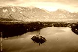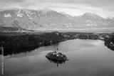 Alpine scenery with lake, island and church in the middle and mountains in backdrop, Bled, Slovenia