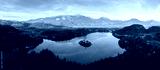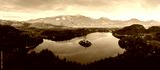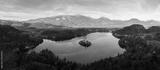 Alpine scenery with lake, island and church in the middle and mountains in backdrop, Bled, Slovenia