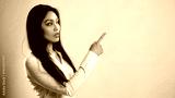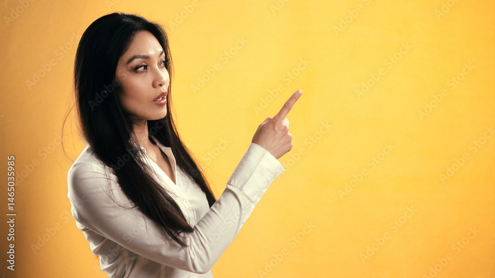 Asian businesswoman pointing her finger to the right on a yellow background with copy space