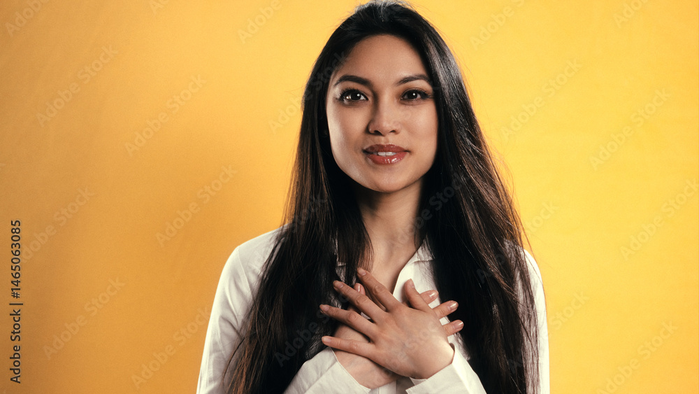 Studio portrait of grateful young Asian woman holding hands on chest, smiling serenely against a vibrant yellow backdrop