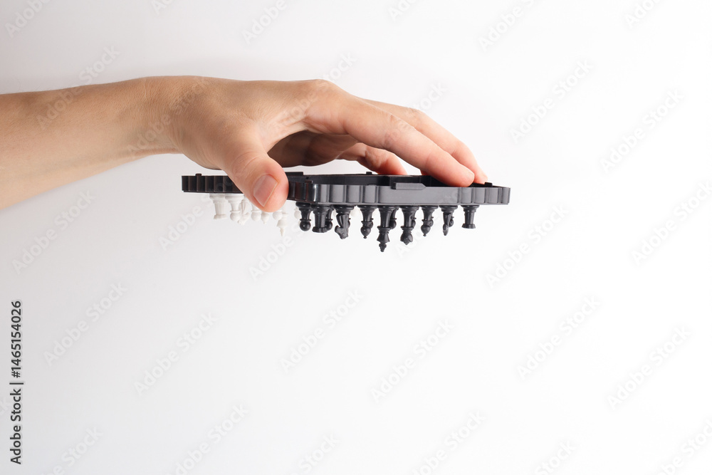 Hand holding small magnetic chessboard upside down with pieces attached. mini magnetic portable game. Strategy and travel board game concept. Design for banner, poster, header