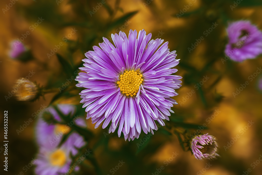 A perennial aster flower with purple petals and a yellow center.Purple flower bud wallpaper.